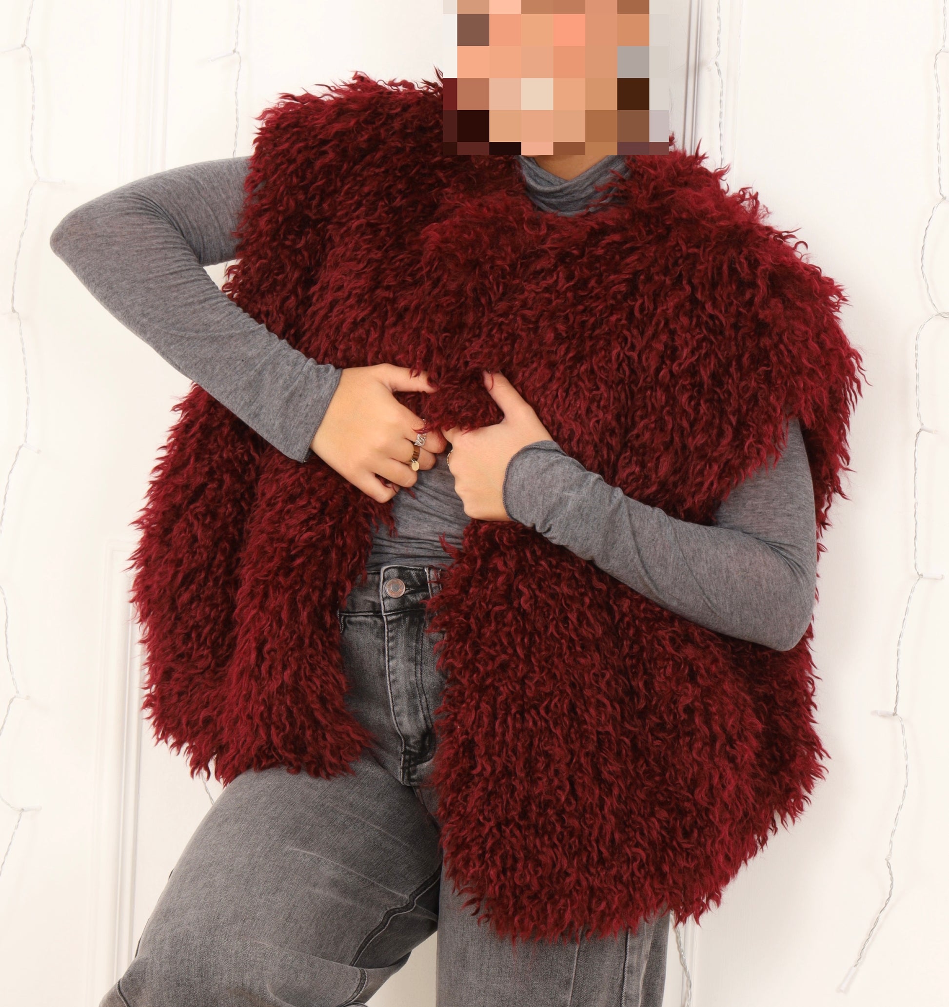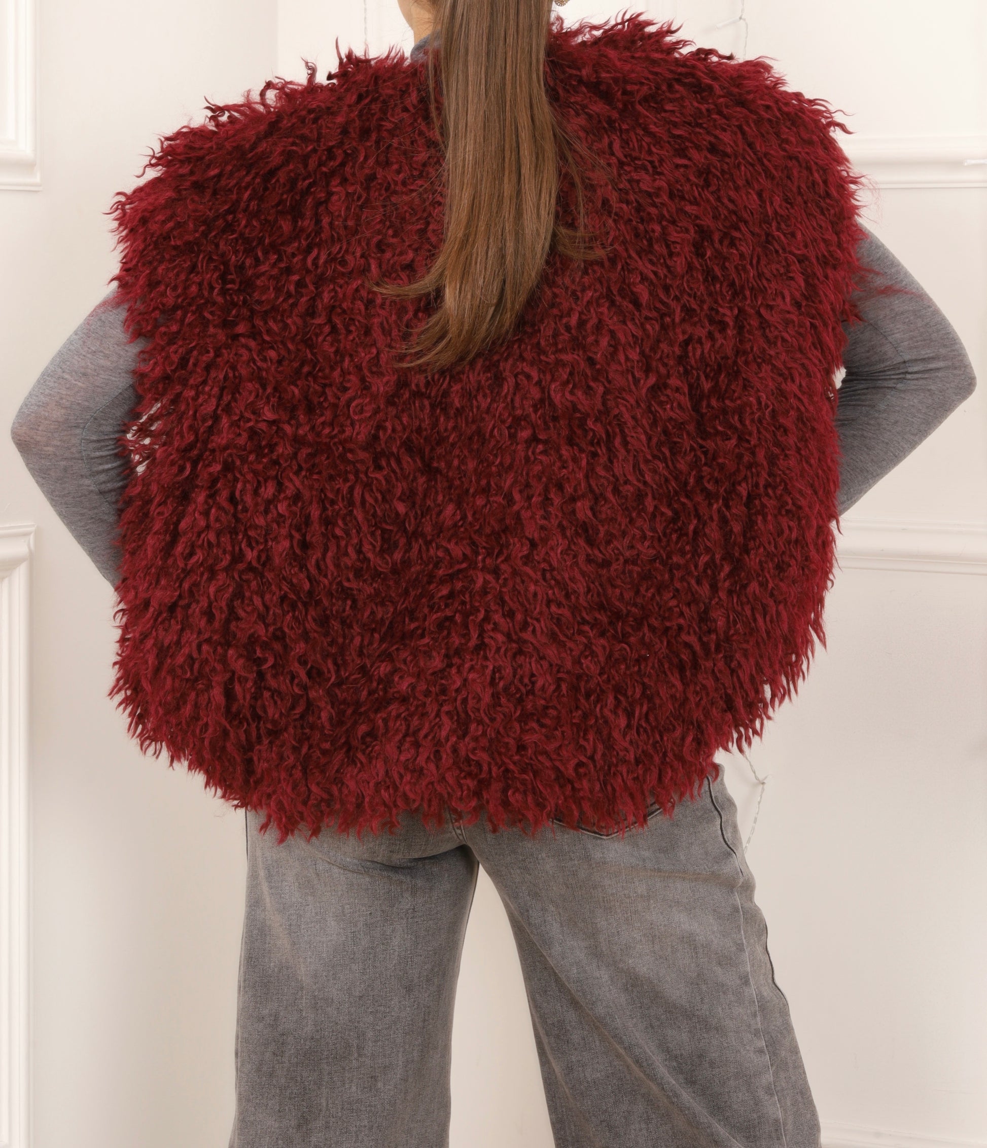 Ce gilet moumoute bouclé couleur Bordeaux est l'incarnation parfaite du confort luxueux. Sa texture bouclée ultra-douce et son coloris riche apportent instantanément une touche de chaleur et de sophistication à votre garde-robe.