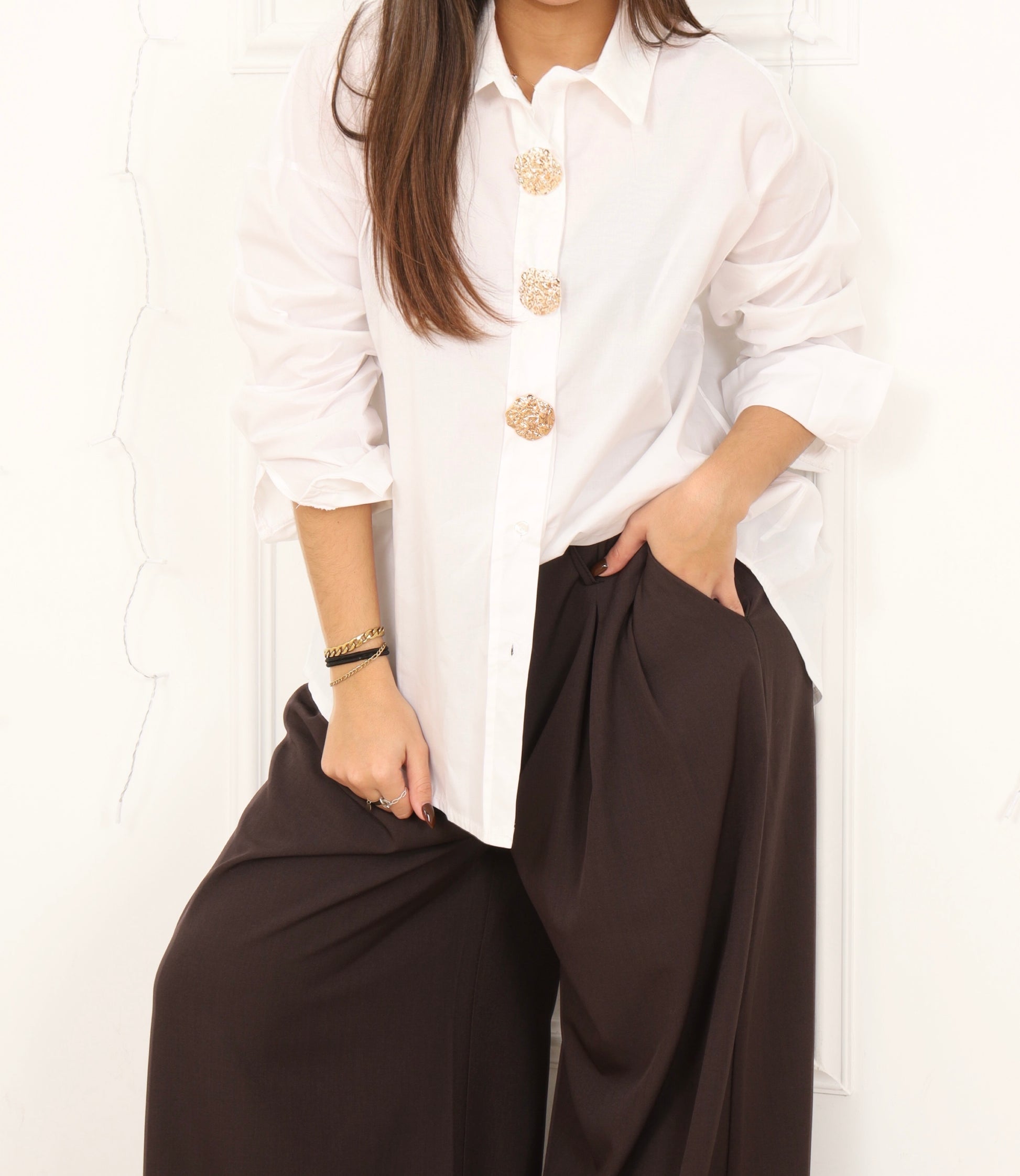 Ce magnifique chemisier se distingue par ses jolies broches ornant délicatement les boutons, transformant une pièce classique en un véritable bijou de mode. Confectionné en Italie dans un mélange raffiné (90% polyester, 10% coton), il allie qualité italienne et confort au quotidien.