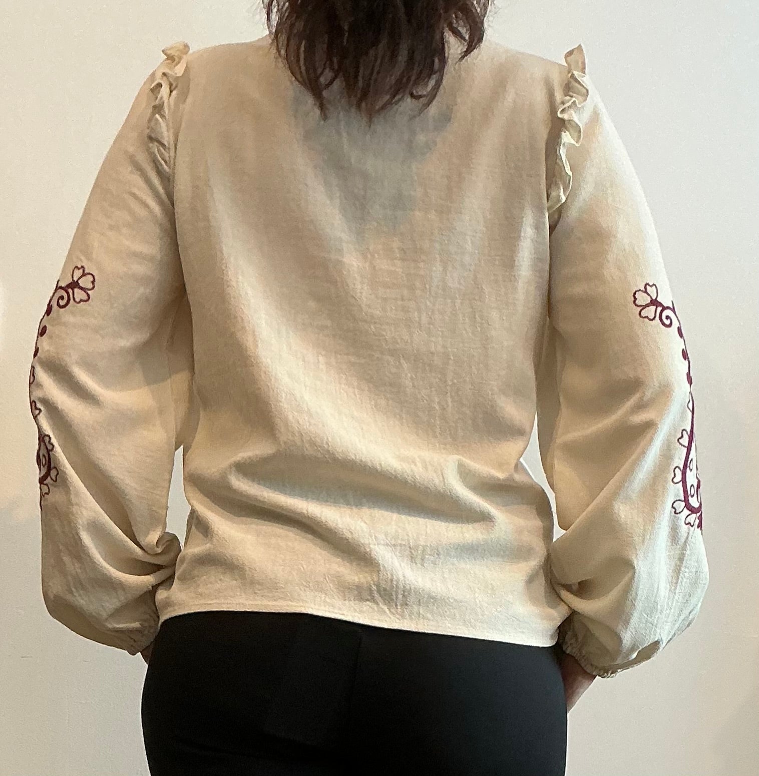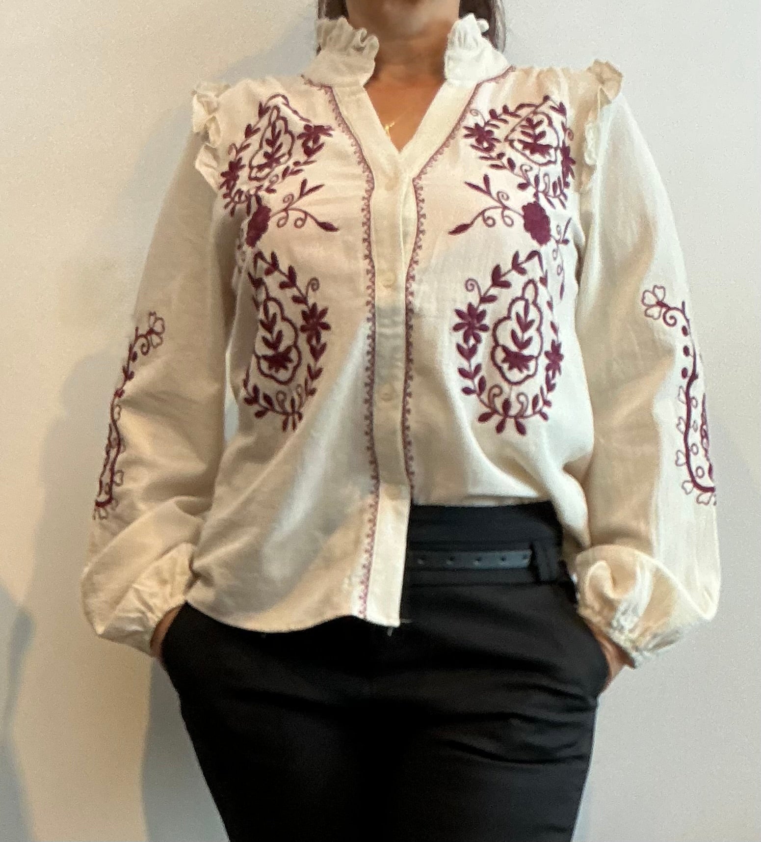 Parfaite pour les beaux jours, elle se porte aussi bien avec un jean pour un look décontracté qu'avec un pantalon fluide pour une allure plus habillée. Les broderies florales captent la lumière et ajoutent une dimension artistique à cette pièce unique.